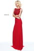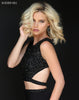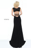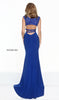 Two-piece jersey with cap sleeve beaded bodice and cut away sides with fitted skirt.