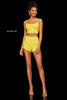 Two-piece, top with lace up back and shorts with detachable chiffon over skirt.