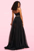 A-line hot fix scuba romper with deep V-Neckline, sheer overskirt, and beaded belt.