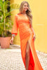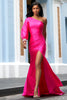Fitted ruched jersey gown with one shoulder bishop sleeve, embellished cuff and a high slit.