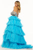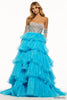 Strapless ball gown with sheer corset, pearl embellishments, pleated organza ruffle skirt and removable pearl sleeves.
