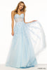 Leaf lace embroidered A-line gown with a sheer corset top, sweetheart neckline and lace up back.