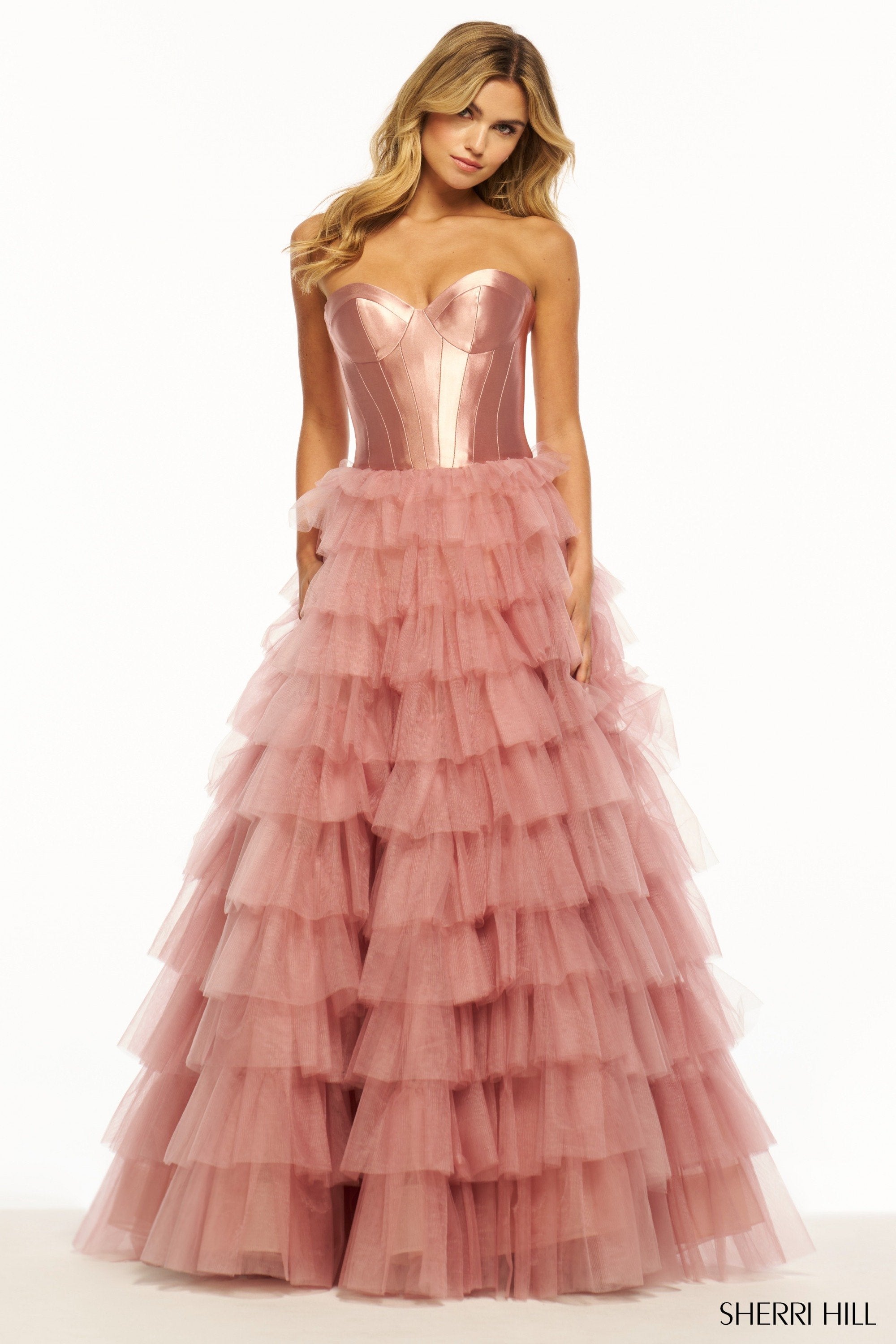 Strapless corset ball gown with tulle ruffle skirt slit.