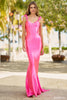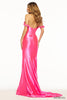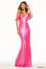 Silky stretched satin gown with corset top, and rosette embellished straps.
