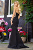 Strapless scuba corset gown with sheer beaded embellished sides and skirt slit.