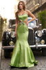 Satin mermaid gown with cut outs, bow and bead embellishments, and an open back.