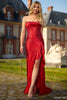 Strapless hot fix gown with corset bodice and ruffle skirt hem with slit.