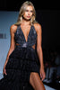 Halter hot fix A-line gown with ruffle skirt, side cuts, and skirt slit.