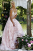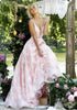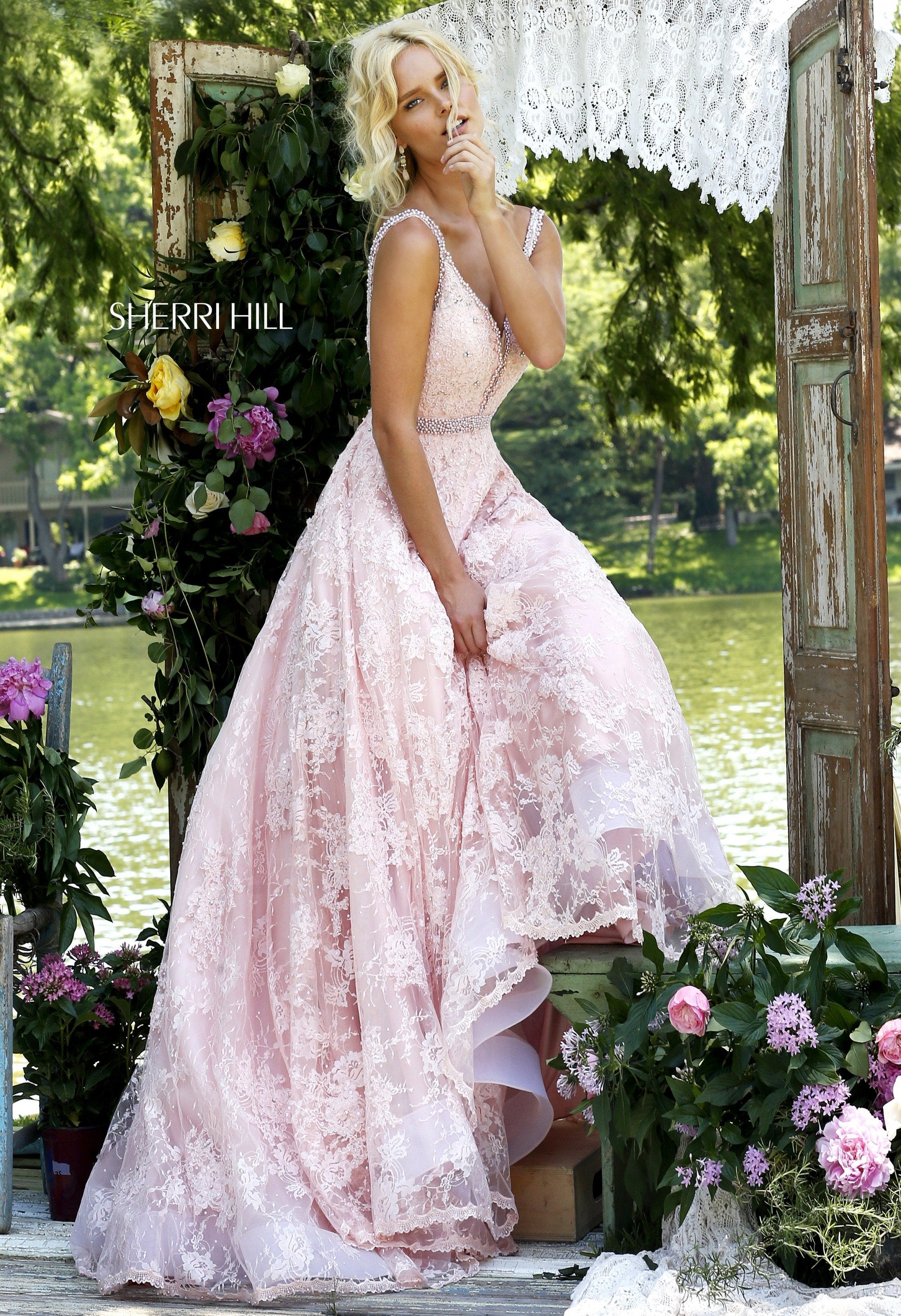 Lace v-neck ball gown with a pearl encrusted pearl belt.