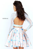 Two piece cocktail with a long sleeve lace bodice and floral skirt.