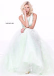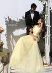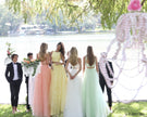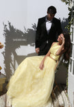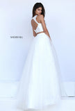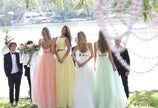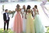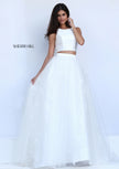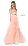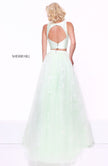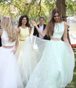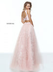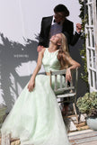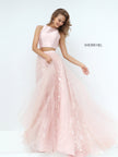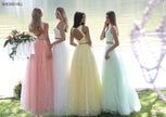 Two-piece with cut out back and A-line tulle skirt with sequin embroidery.