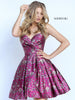 Printed A-line cocktail dress with strapless sweetheart neckline.