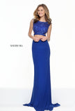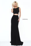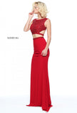 Two-piece jersey with cap sleeve beaded bodice and cut away sides with fitted skirt.