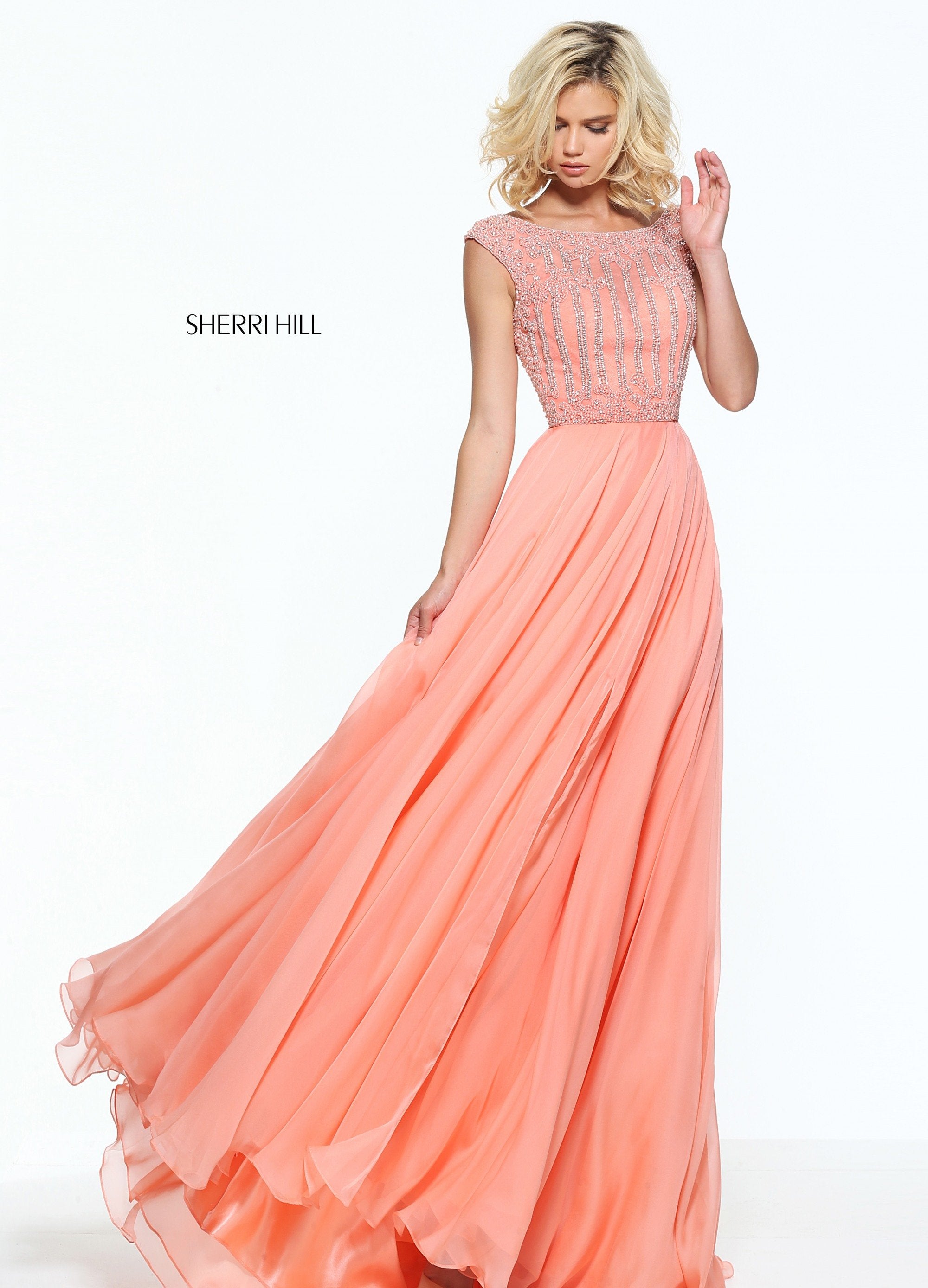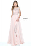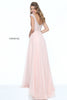 Chiffon cap sleeve gown with a pearl and rhinestone bodice.