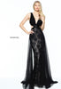 V-neck fitted lace column with a chiffon over skirt.