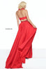 Taffeta A-line gown with a halter ruffle bodice and a beaded waist band.