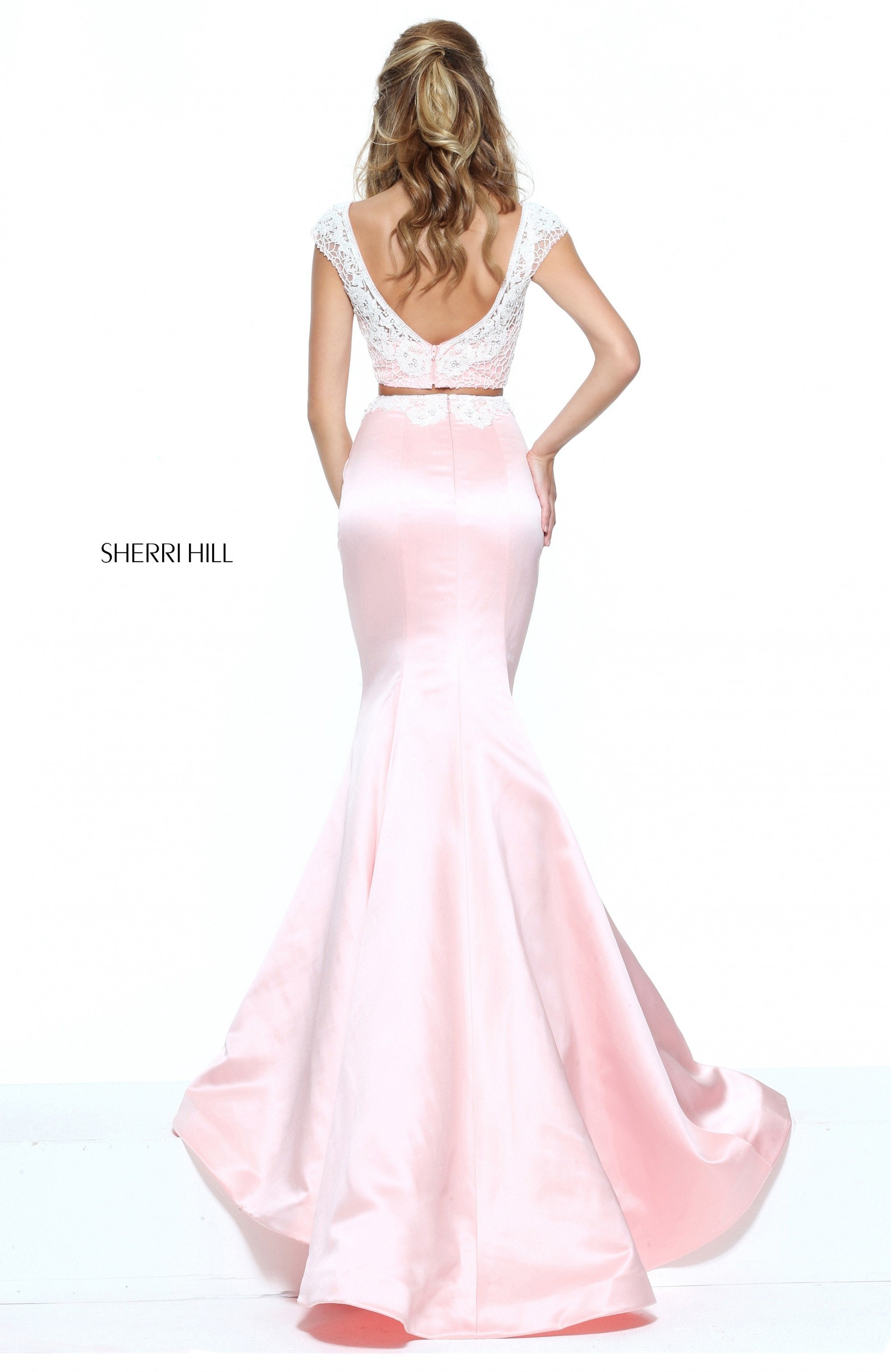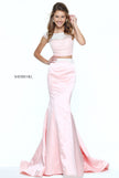 Two-piece satin mermaid with an ivory beaded bodice and waistband detail.