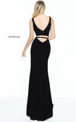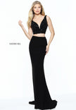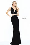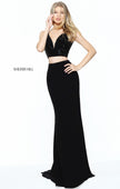 Two-piece fitted jersey with a beaded V-neck bodice.