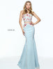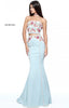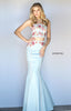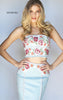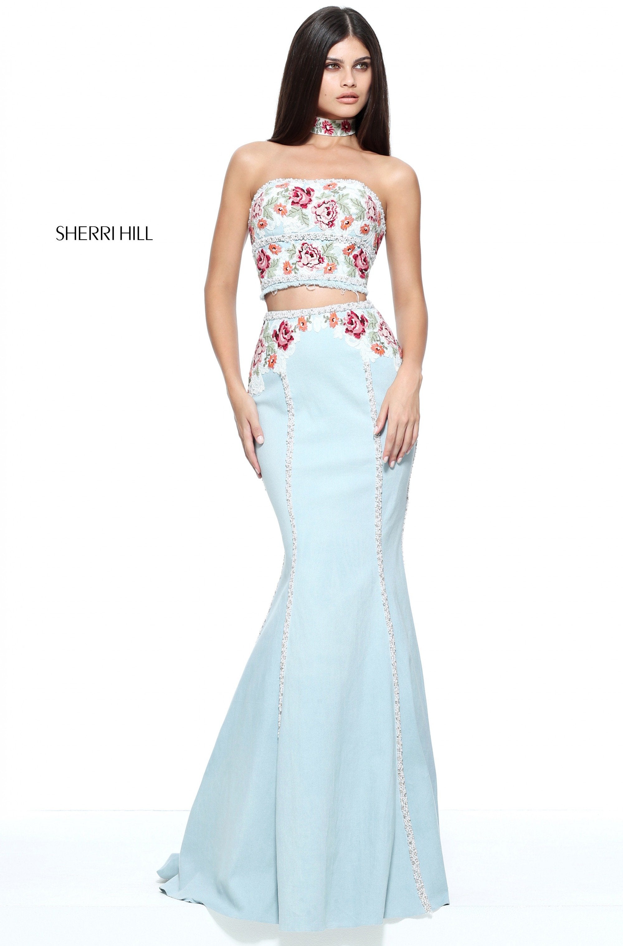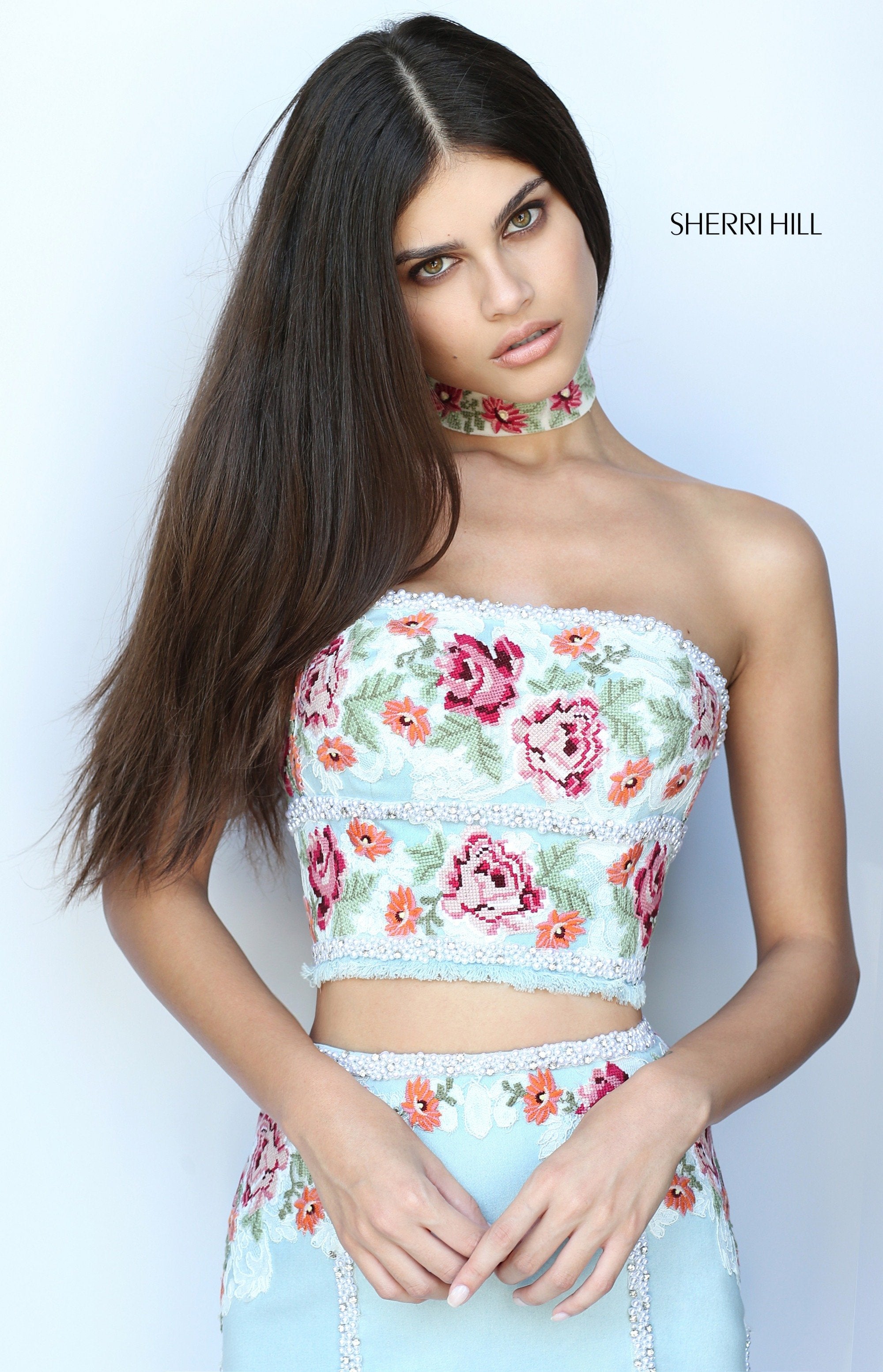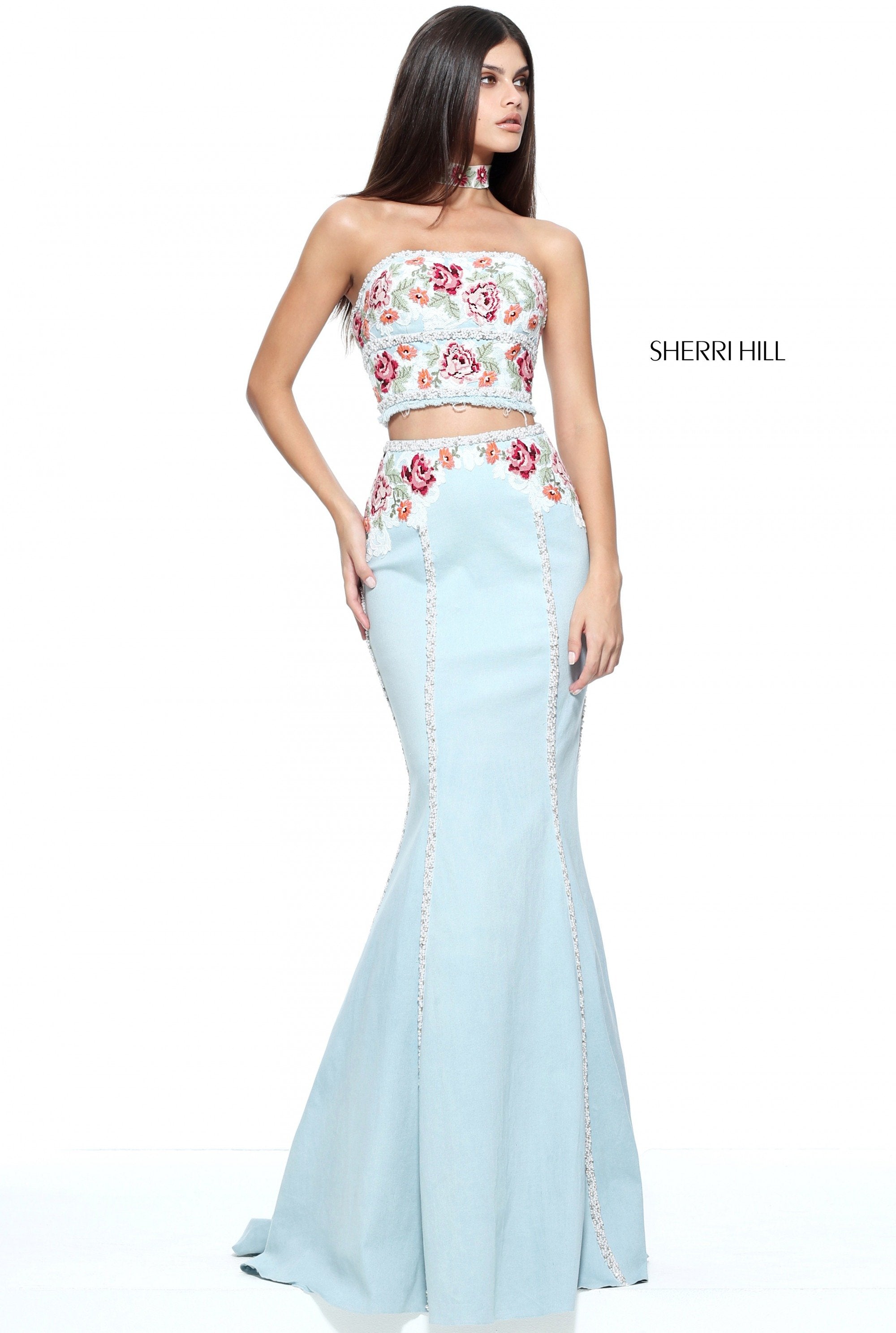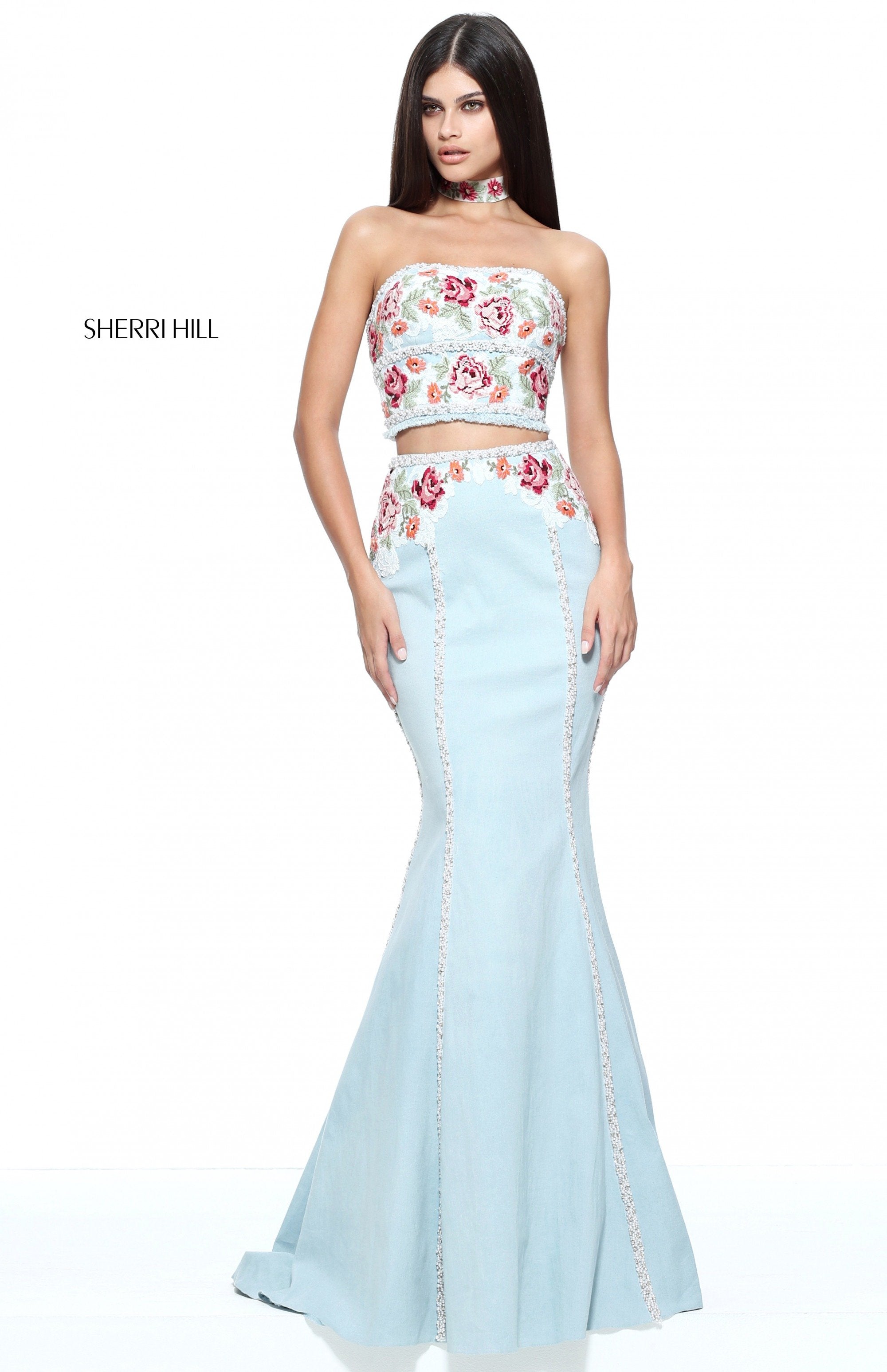 Two-piece denim mermaid with a strapless cross stitch floral embroidered bodice and matching choker.