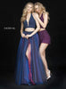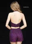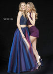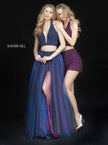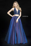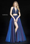 Two piece with beaded deep V halter bodice with beaded shorts and an organza ball gown removable overskirt.