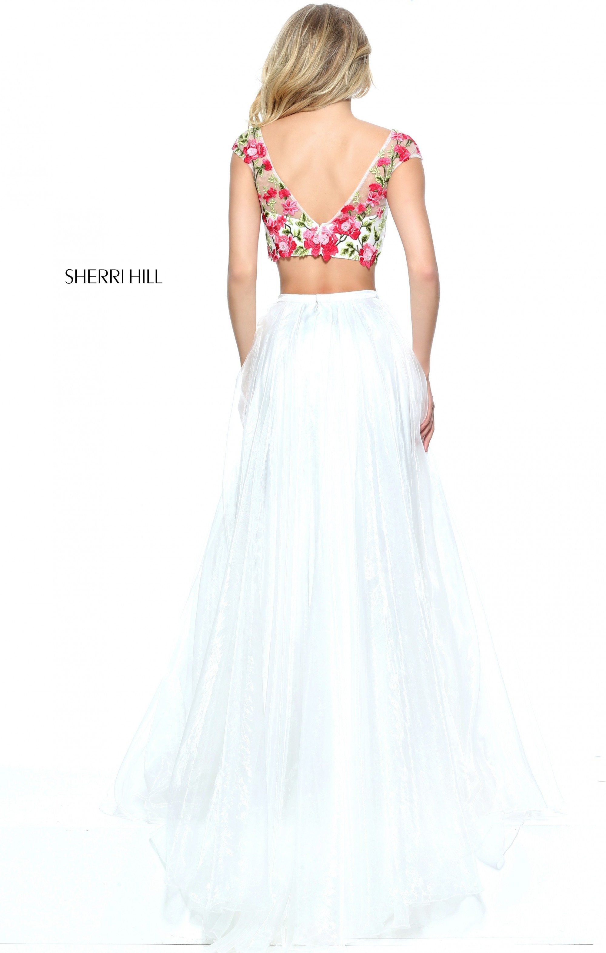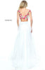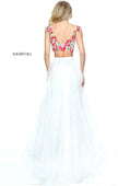 Cap sleeve flower appliqued two-piece A-line gown with a chiffon skirt.