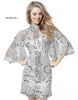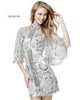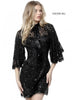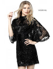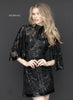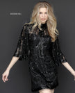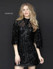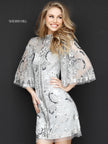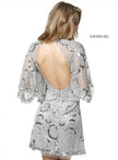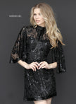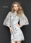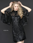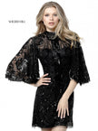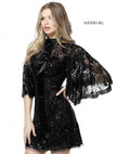 Lace and bead appliqued cocktail with high neck bodice, flare sleeves and cut out back.