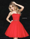 Strapless cocktail with sequin stretch scuba bodice and tulle A-line skirt.
