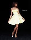 Strapless taffeta cocktail with A-line skirt and bead appliqued pockets.