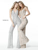 Beaded jumpsuit with V neck bodice and flare pants.