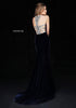 Velvet gown with halter bead appliqued neck and slit skirt.