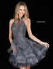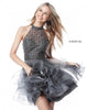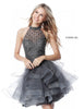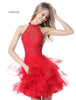 High neck beaded bodice with ruffled tulle cocktail skirt.