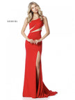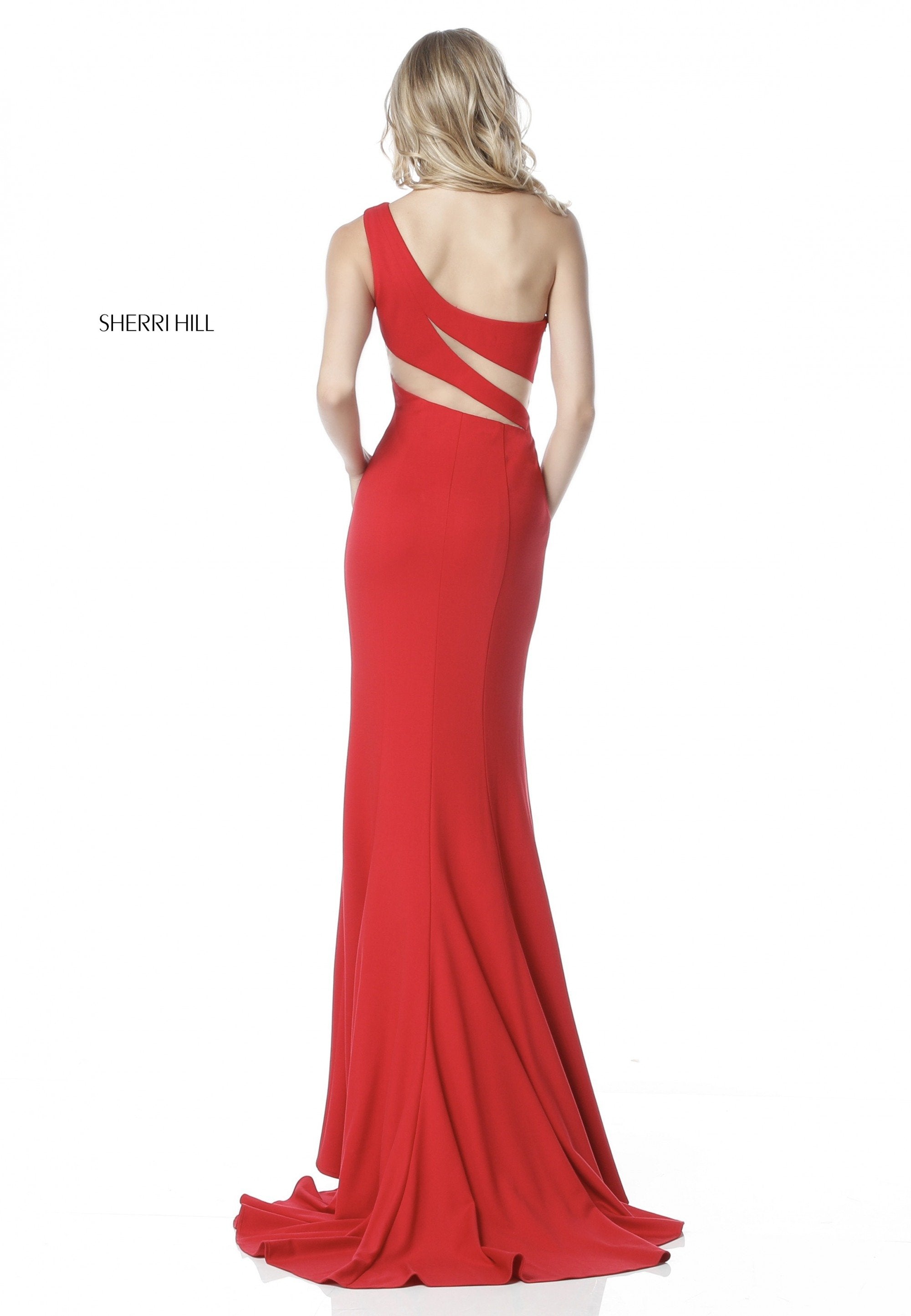 One shoulder scuba gown with bodice cut outs.
