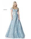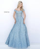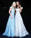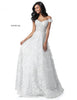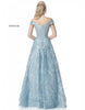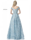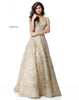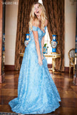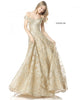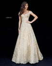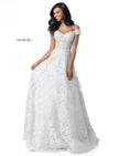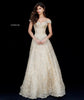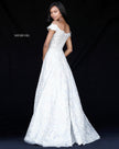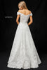 Metallic lace A-line gown with sweetheart bodice and off-the-shoulder straps.