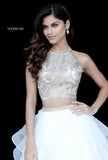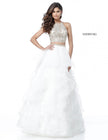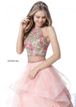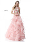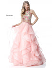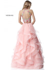 Lace high neck floral embroidered crop top with a ruffled organza ball gown skirt.