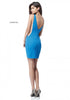 Beaded fitted jersey cocktail dress with deep V and low back.