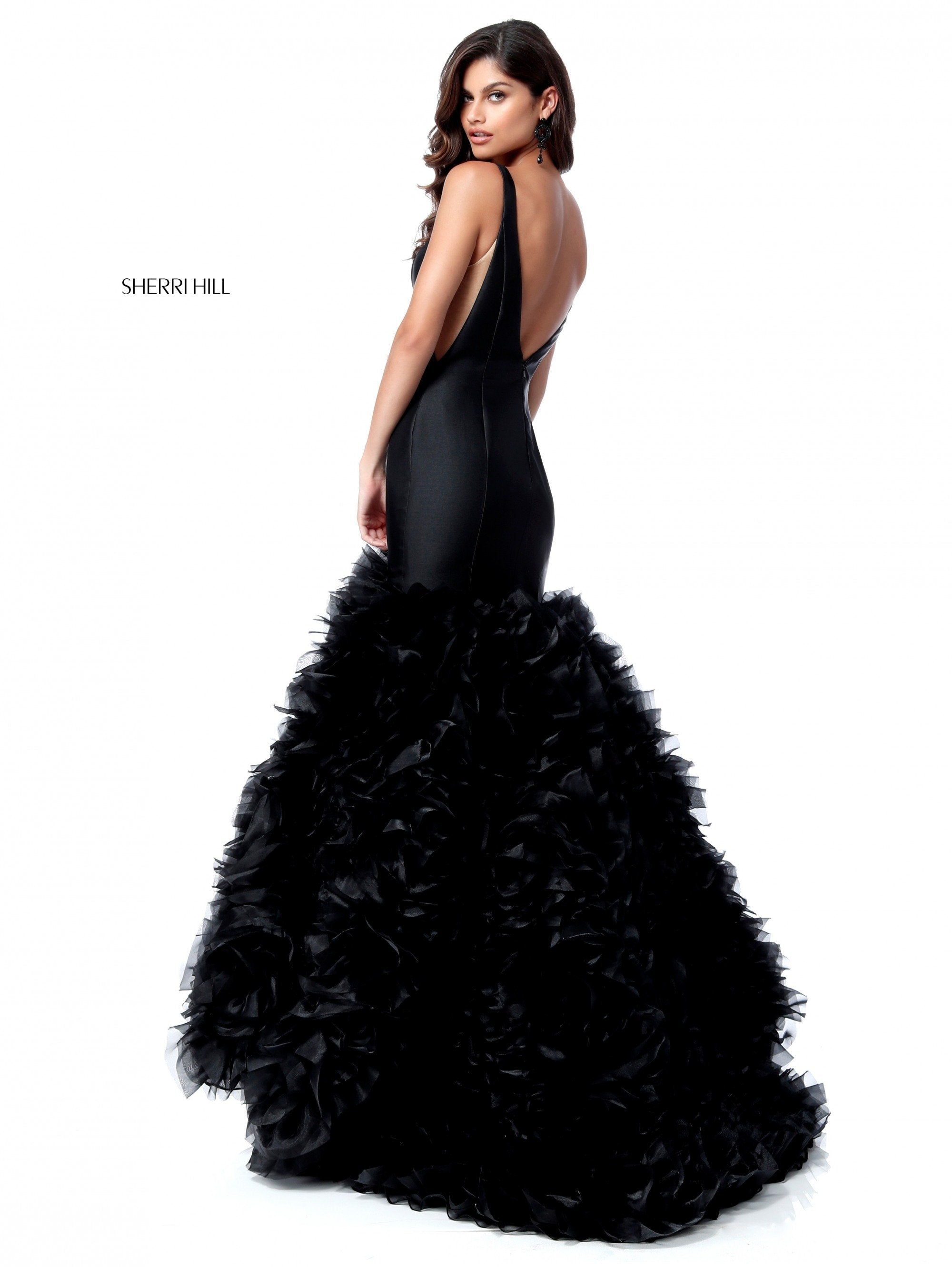 Deep V taffeta bodice with low back and ruffle tulle mermaid skirt.
