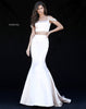 Satin two piece mermaid with beaded detail on bodice off-the-shoulder straps.