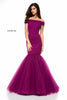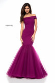 Jersey beaded off-the-shoulder bodice with tulle mermaid skirt.