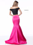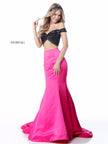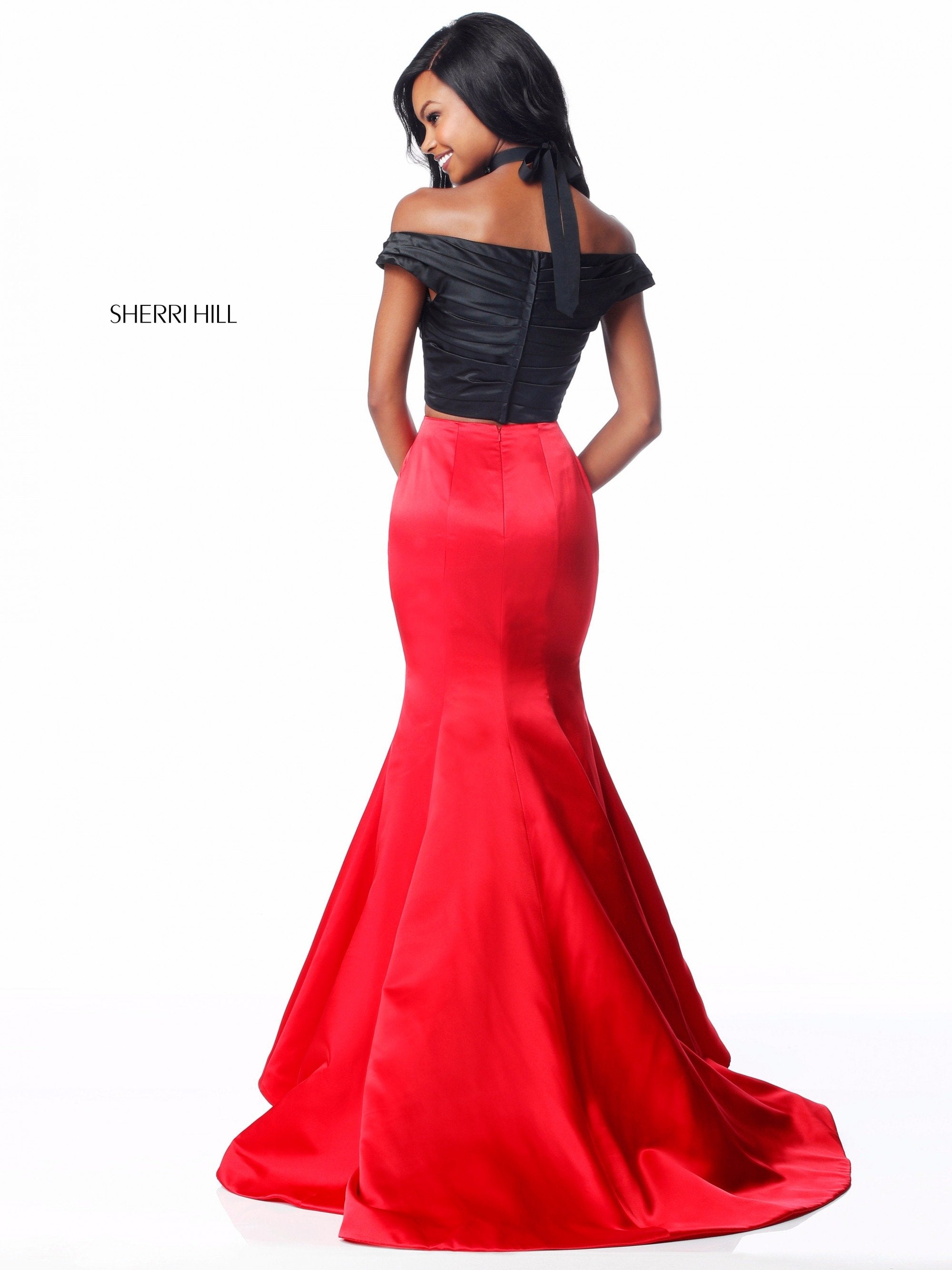 Satin mermaid two piece with front cross bodice and cherry detail on choker or headband.