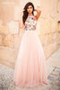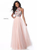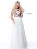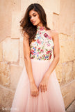 Flower embroidered high neck bodice with cut out back and chiffon skirt.