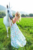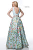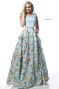 Taffeta two piece with floral print ball gown skirt and solid color bodice with bows on shoulders.