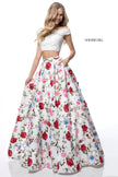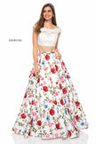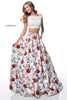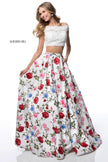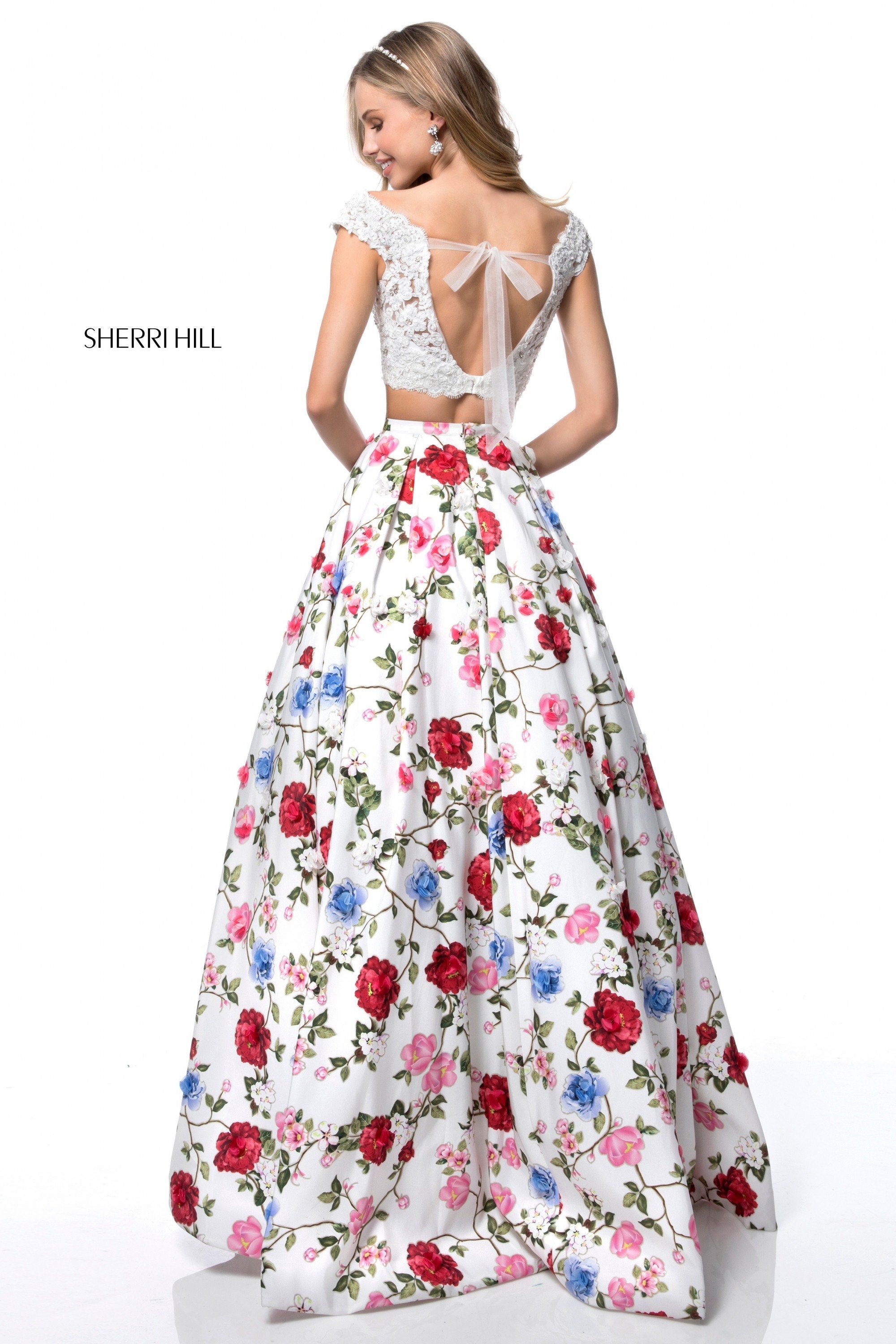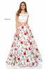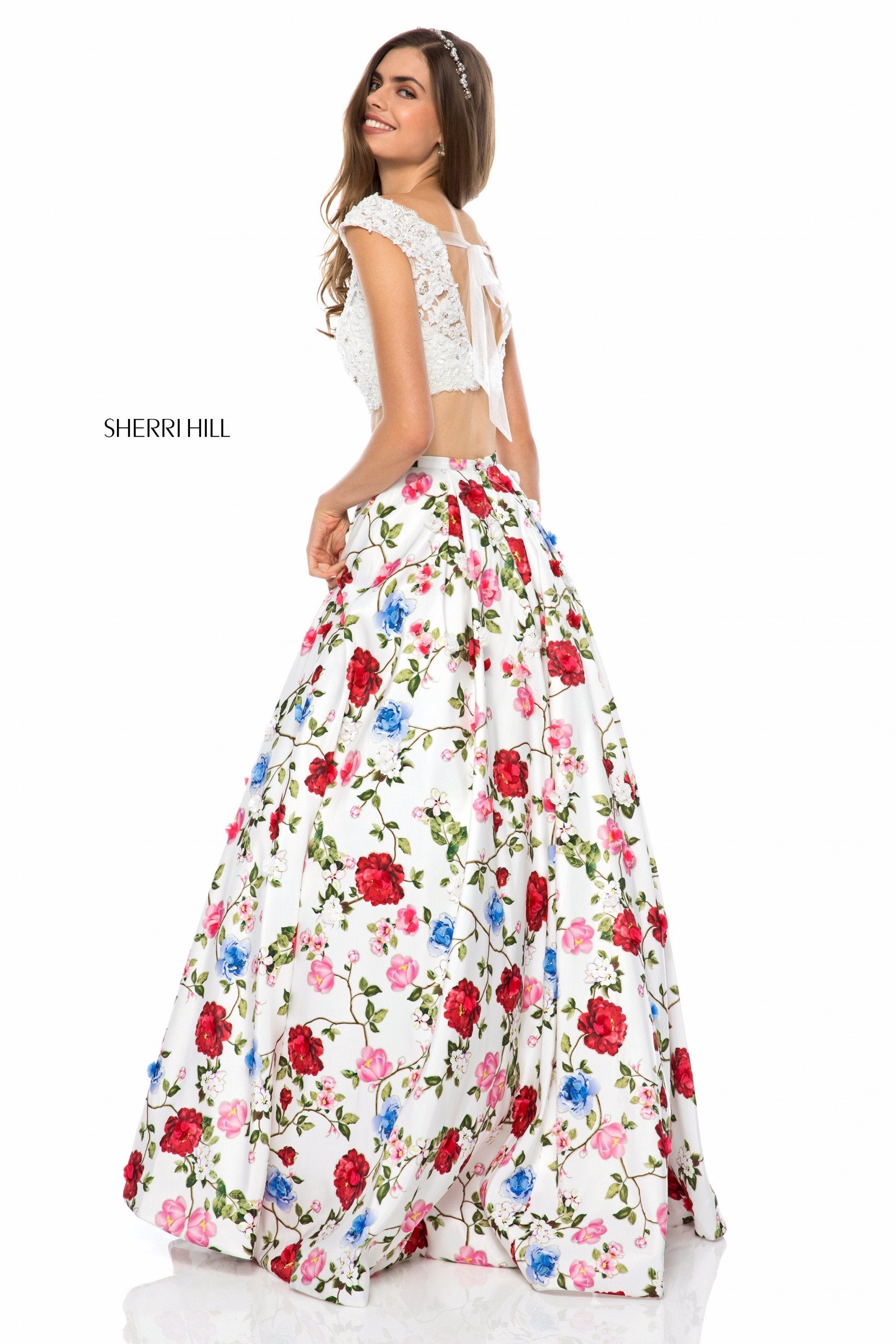 Two piece with lace appliqued bodice and floral print ball gown skirt.