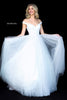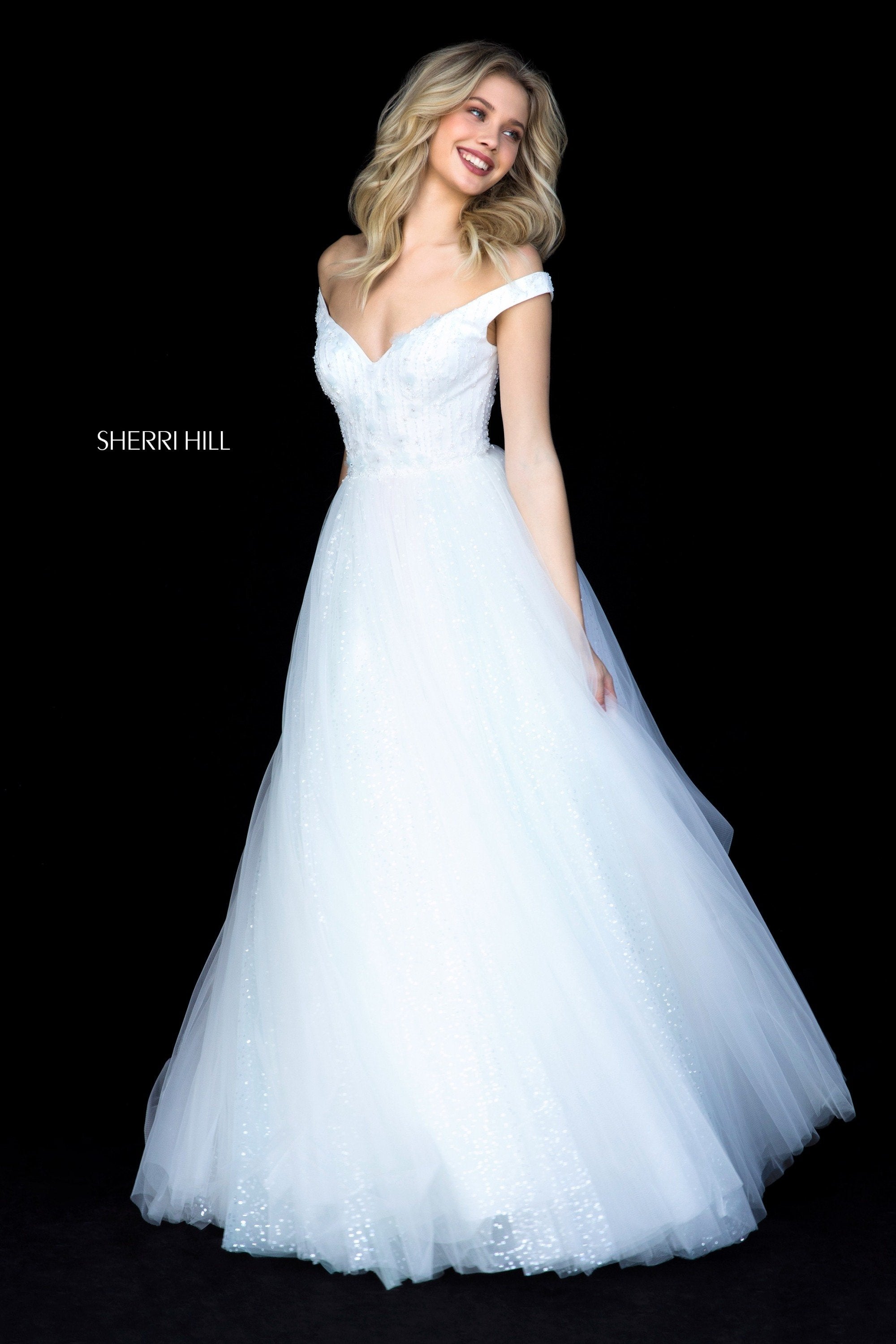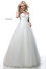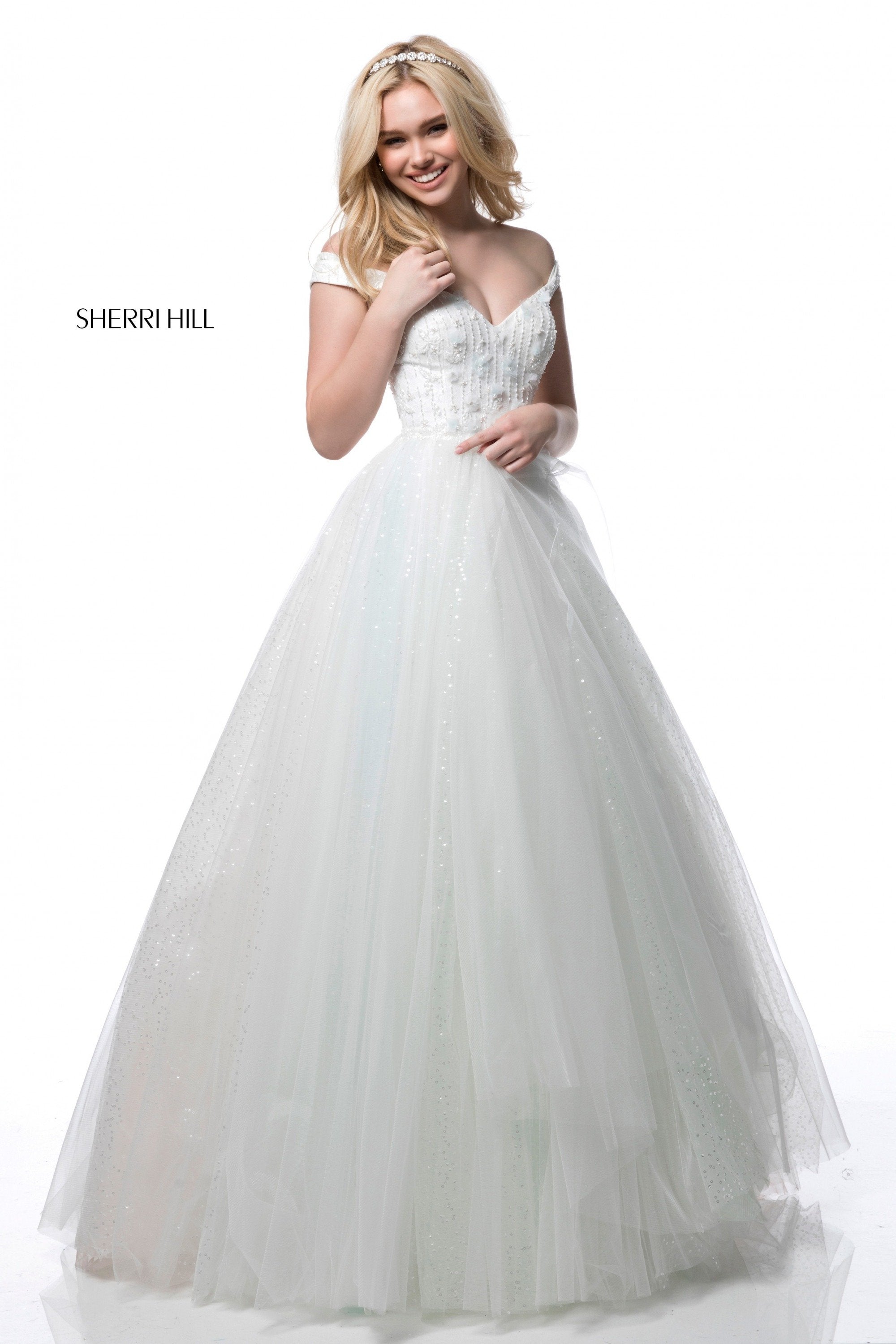 Satin flower appliqued bodice with off shoulder straps and tulle ball gown skirt.