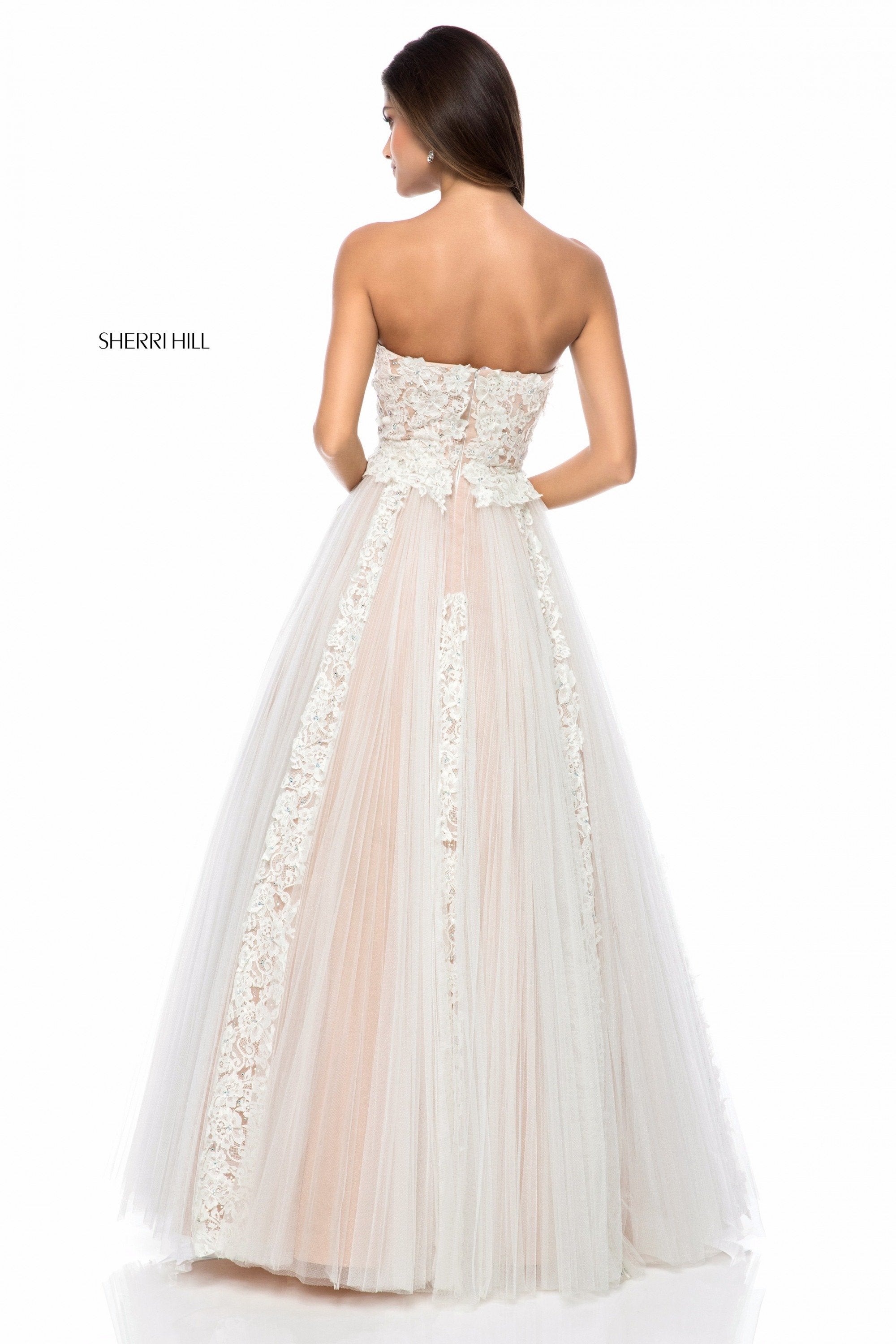 Strapless lace appliqued ball gown with tulle skirt.