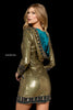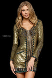 Long sleeve sequin cocktail dress with V-neck bodice and hoodie.