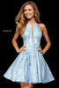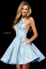 Brocade cocktail with slit bodice and sheer sides.