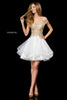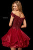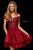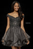 Metallic lace bodice with off-the-shoulder straps and ruffle organza cocktail skirt.