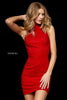 Sequin stretch scuba cocktail with high neck halter bodice and lace up back.