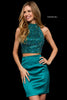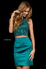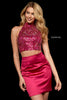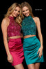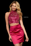Two piece with beaded high neck bodice and charmeuse cocktail skirt.