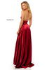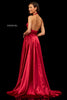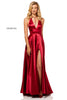 Silk charmeuse gown with a halter deep-V bodice and slit skirt.
